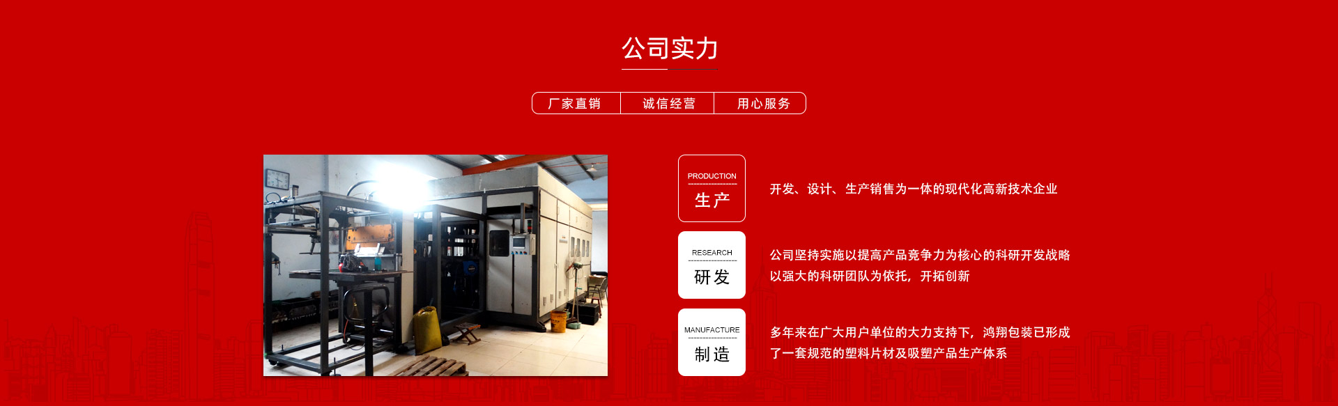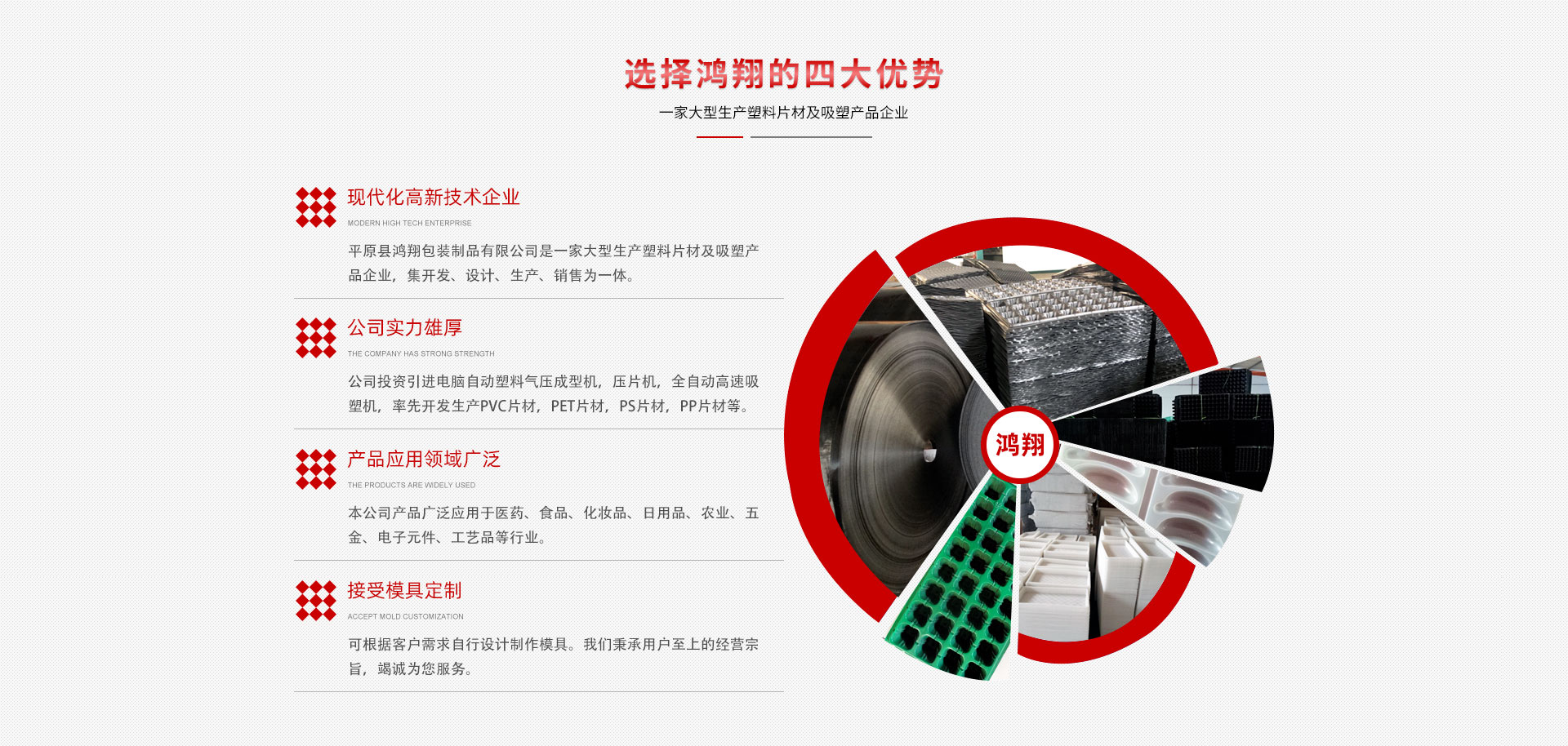 平原縣鴻翔包裝制品有限公司是一家大型生產(chǎn)塑料片材及吸塑產(chǎn)品企業(yè),本公司投資引進電腦自動塑料氣壓成型機,壓片機,全自動高速吸塑機,率先開發(fā)生產(chǎn)PVC片材,PET片材,PS片材,PP片材等,鴻翔是國內(nèi)先進的生產(chǎn)廠家之一。本公司產(chǎn)品廣泛應用于醫(yī)藥、食品、化妝品、日用品、農(nóng)業(yè)、五金、電子元件、工藝品等行業(yè),也可根據(jù)客戶需求自行設計制作模具。本公司技術力量雄厚,生產(chǎn)設備工藝先進。我們秉承用戶至上的經(jīng)營宗旨,竭誠為您服務。